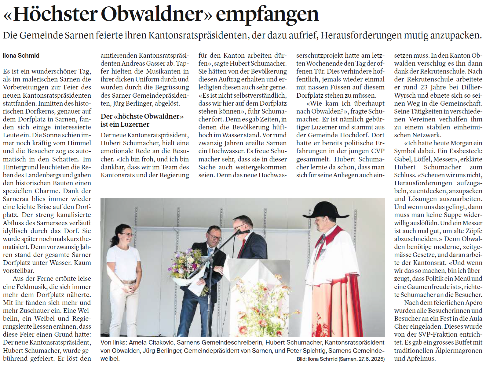 Herzliche Gratulation zur Wahl. Der Jodlerklub Sarnen wünscht dir ein erfolgreiches Jahr als Kantonsratspräsident.